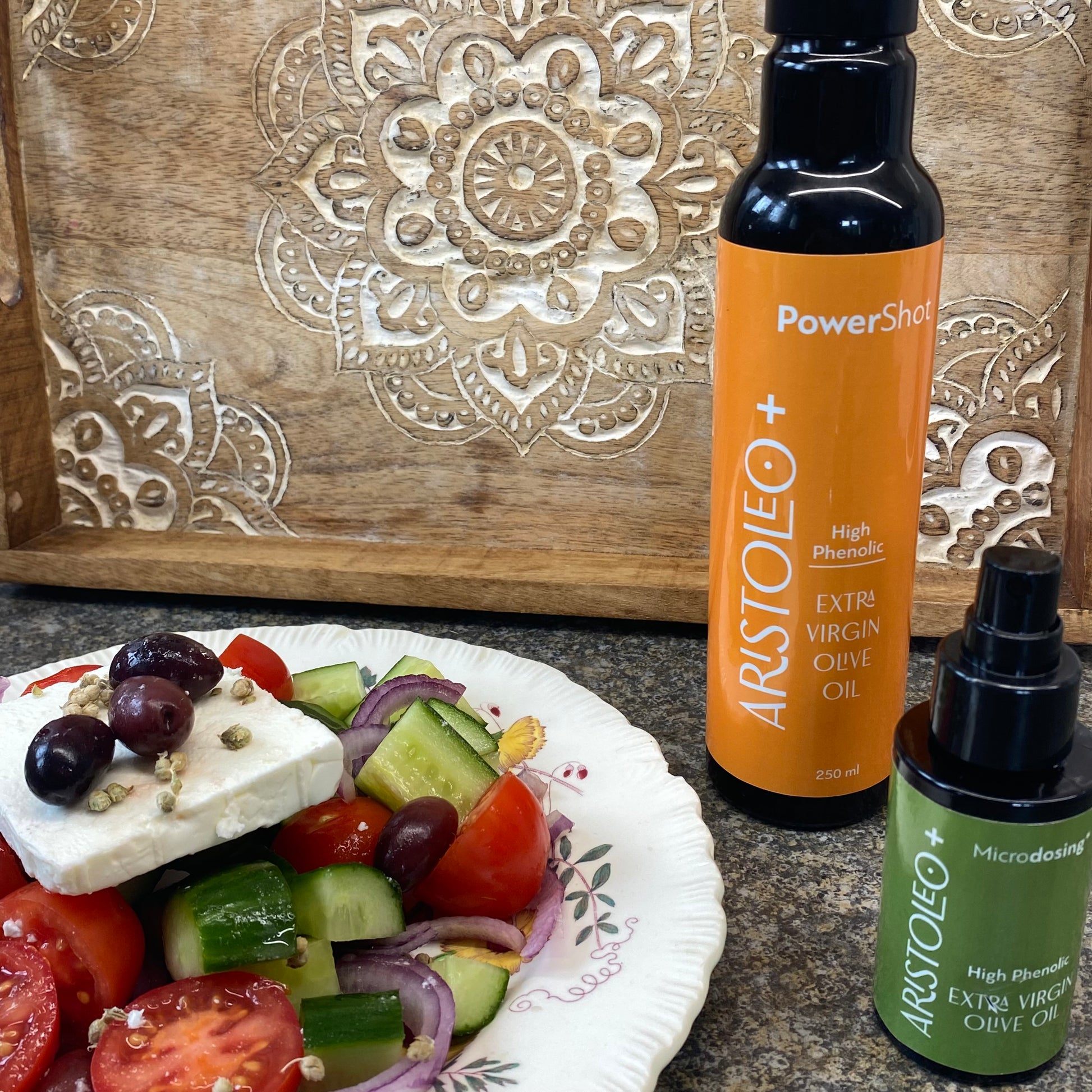 Aristoleo+ PowerShot is sourced from certified HP EVOO, consistently above 1200mg/kg of active biophenols — the full derivative spectrum of hydroxytyrosol and tyrosol, including oleocanthal, oleacein, and the secoiridoid compounds where therapeutic value actually resides.